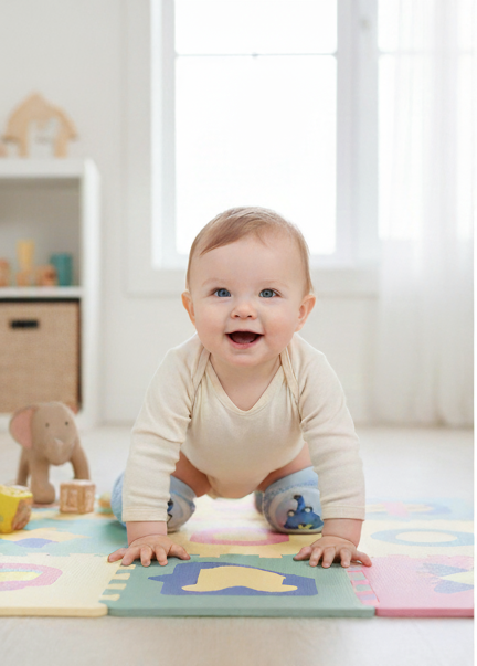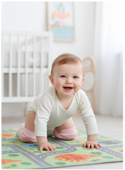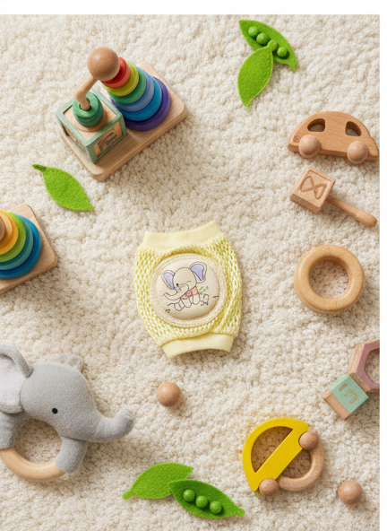 Soft and stretchy baby crawling knee pads with cushioned pads that protect little knees on hard floors.