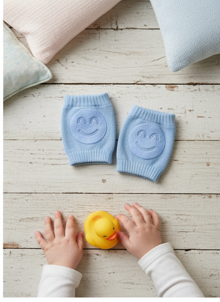 Soft and stretchy baby crawling knee pads with cushioned red pads that protect little knees on hard floors.