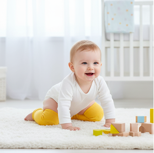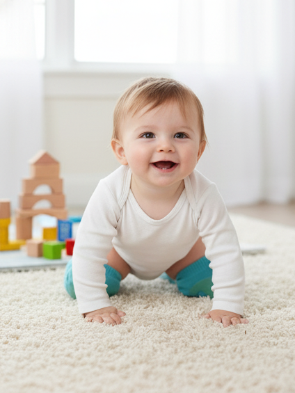 Made from breathable cotton blend with non slip grip and flexible fit for active babies learning to crawl.