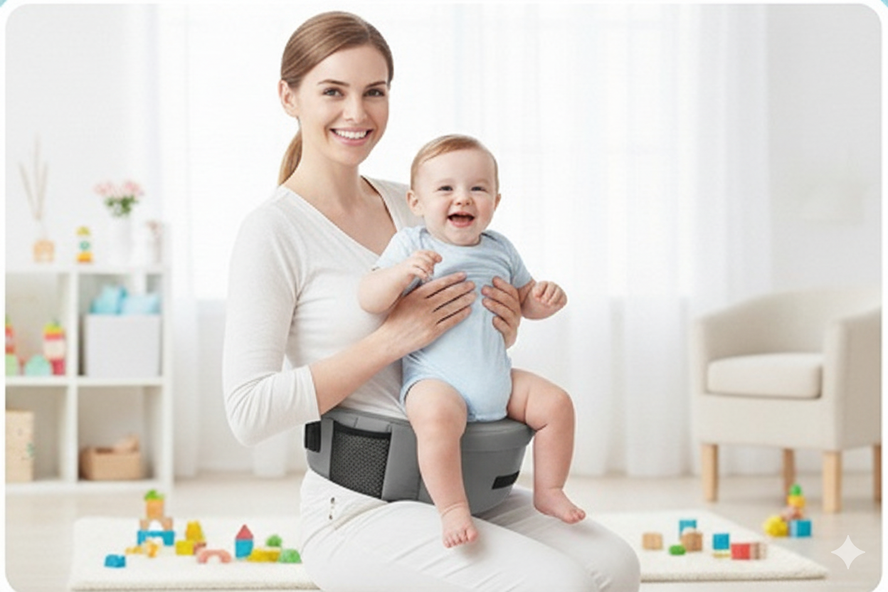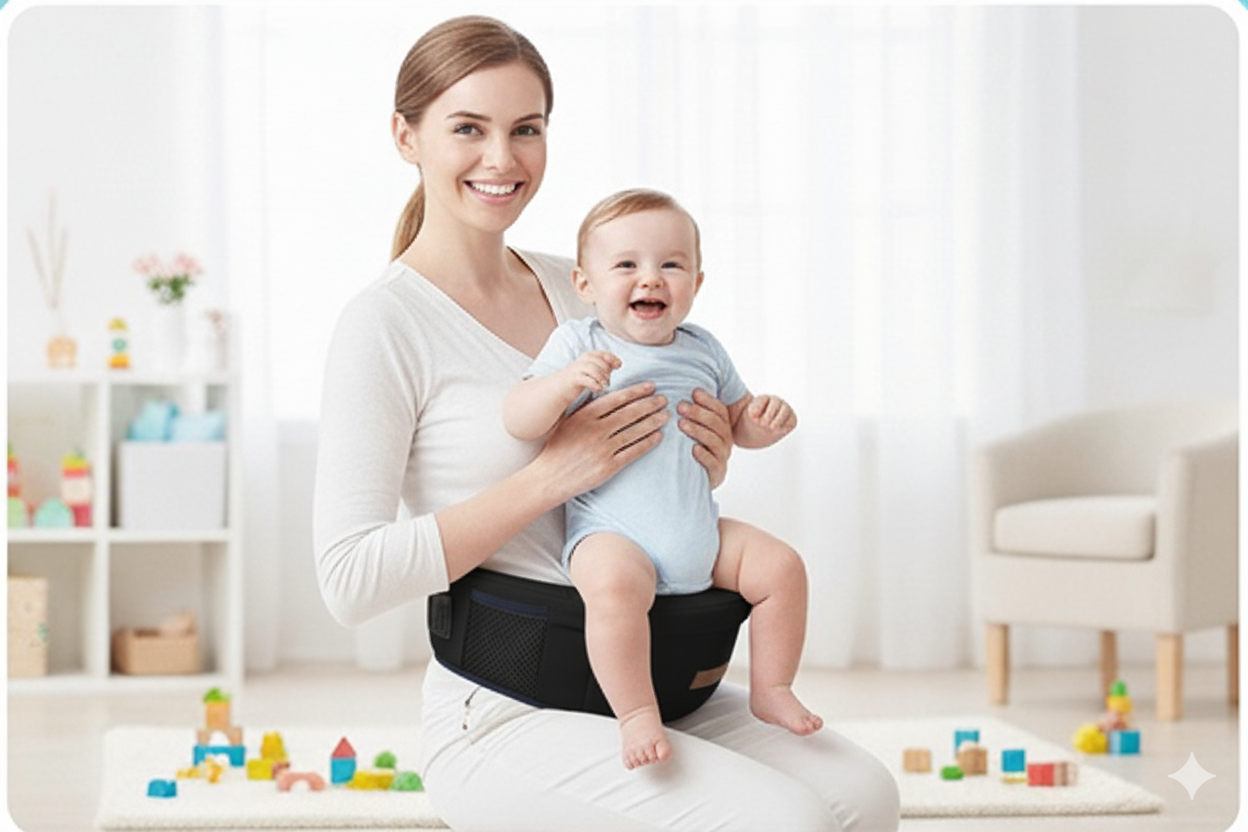 Comfortable ergonomic baby hip seat carrier designed to reduce back and arm strain while holding your baby.